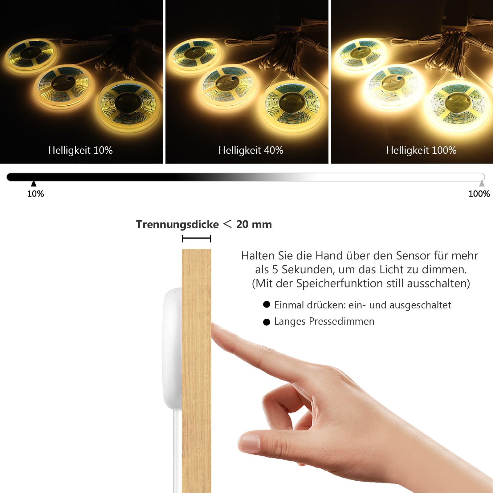 - 【Verdeckter Steuerschalter】COB Led Streifen Das Schaltsignal wird durch das dielektrische Material von Holz, Stein, Kunststoff, Glas und anderen nicht-metallischen leitfähigen Materialien übertragen Kontaktabstand: je dünner die Dicke, desto höher die Steuerempfindlichkeit. Holzplatten werden innerhalb von 2,5 cm gesteuert. Metallische Materialien verursachen Störungen!