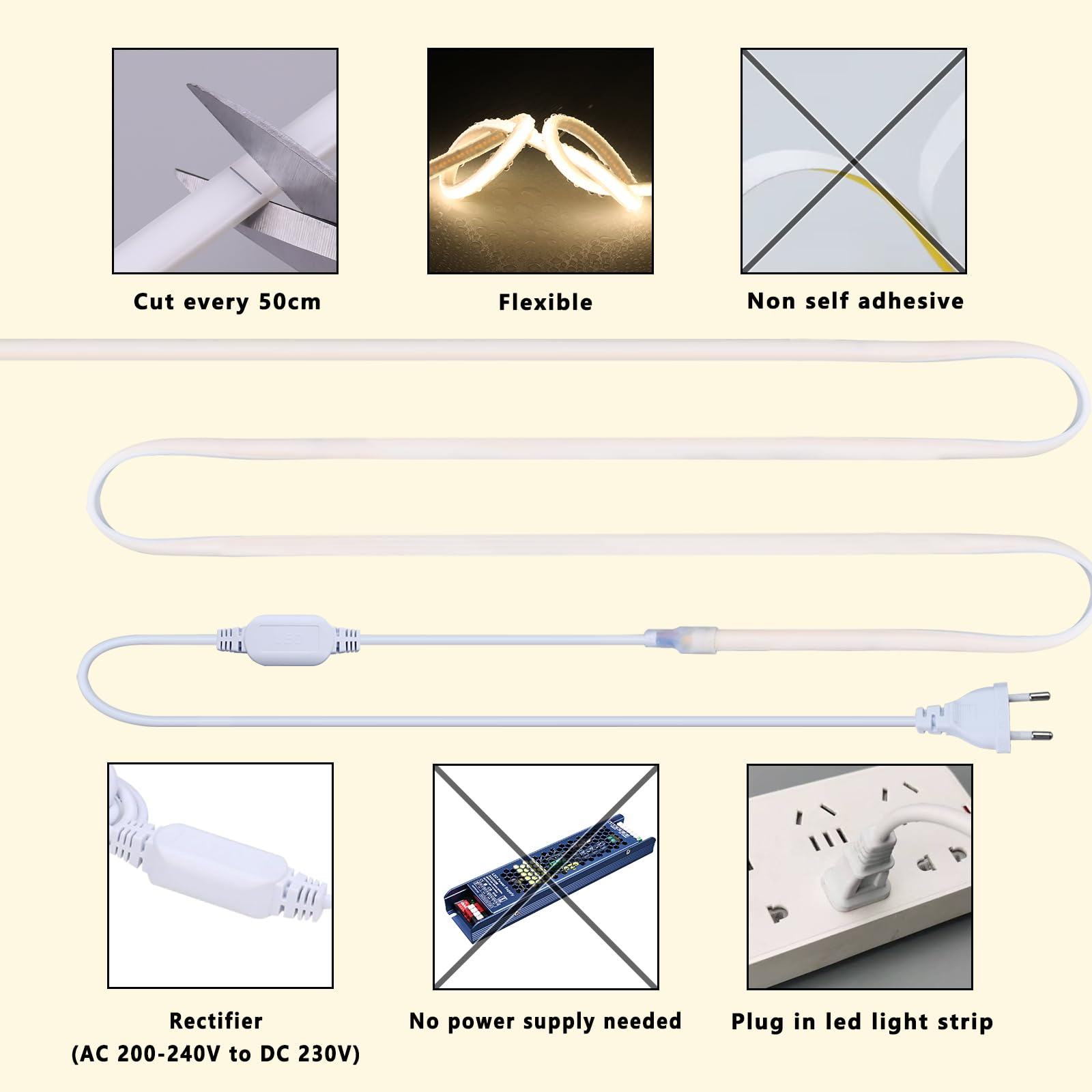- 【AC 220V 230V Direktanschluss】Der led beleuchtung ist ein 200V-240V Hochspannungsstreifen zuschneidbar, es gibt keinen Unterschied in der Helligkeit zwischen dem oberen und unteren Teil des Hochspannungs led leuchtstreifen und es gibt keine Notwendigkeit für einen separaten Stromtreiber! Der led bänder kommt mit dem Stecker und Gleichrichter bereits installiert und kann direkt an das Netz für den Einsatz angeschlossen werden.