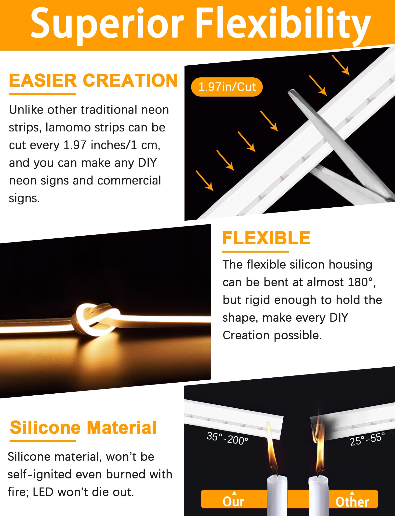 - 【DURABLE & LONG-LASTING& SAFE】- Der warmweiße LED-Streifen wurde mit langlebigen Komponenten hergestellt, die für Beleuchtung und Dekoration geeignet sind. Es erfüllt Ihren Bedarf für Home Decor oder jede geschäftliche Nutzung. Dieses flexible LED-Neon-Lichtband arbeitet mit 24 V Gleichstrom, wodurch es nur wenig Wärme entwickelt. So ist es berührbar für Kinder und Erwachsene