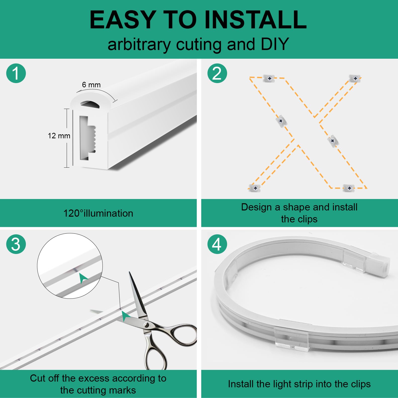 - 【Schneidendesign】Der weiße LED-Streifen kann entlang der Schnittmarken alle 2,5 cm auf die gewünschte Länge geschnitten werden, ohne den Rest des Streifens zu beschädigen. Der Neon-LED-Streifen kann leicht in jede Form oder jedes Design gebogen werden, ideal für die Heimdekoration oder die Herstellung einzigartiger Werbetafeln.