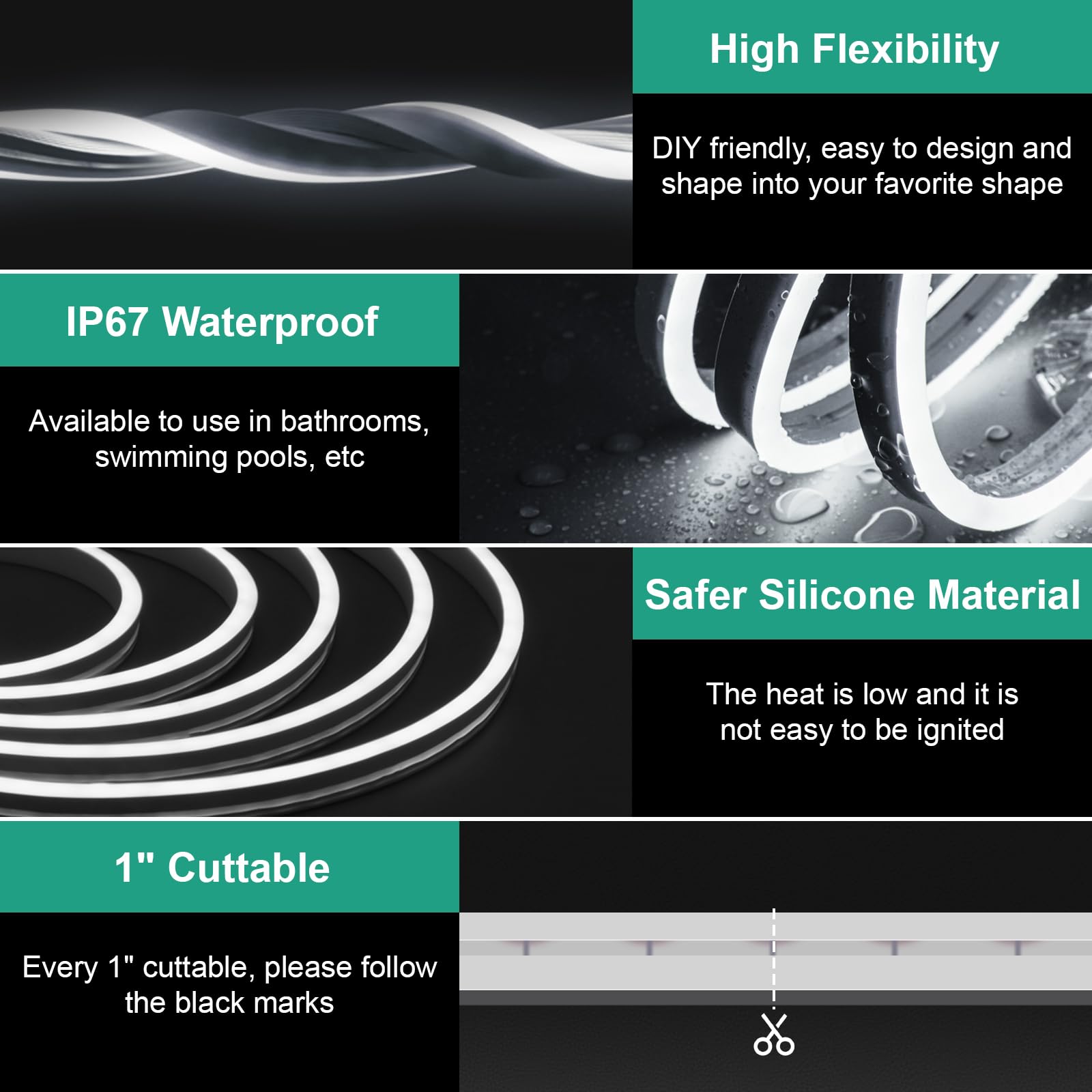 - 【Sicherheit & Wasserdicht】Neon LED Streifen wird mit 24V DC Niederspannung betrieben, die sehr wenig Wärme erzeugt und sicher für Kinder und niedliche Haustiere ist.LED Neonstreifen IP67 wasserdichtes Rating, langlebig & wetterfest & hitzebeständige Silikonkonstruktion. Kann in Schwimmbädern / starkem Regen verwendet werden. (Hinweis: der Stromadapter ist nicht wasserdicht)